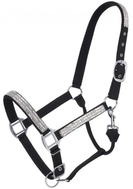 Fully adjustable nylon halter with brushed nickel hardware. Crystal accents on cheeks, crown, and nose. Features an adjustable nose and crown with snap at cheek.