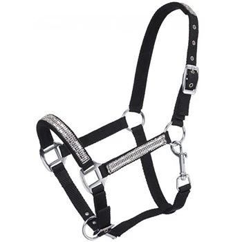Fully adjustable nylon halter with brushed nickel hardware. Crystal accents on cheeks, crown, and nose. Features an adjustable nose and crown with snap at cheek.