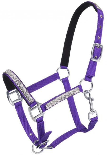 Fully adjustable nylon halter with brushed nickel hardware. Crystal accents on cheeks, crown, and nose. Features an adjustable nose and crown with snap at cheek.