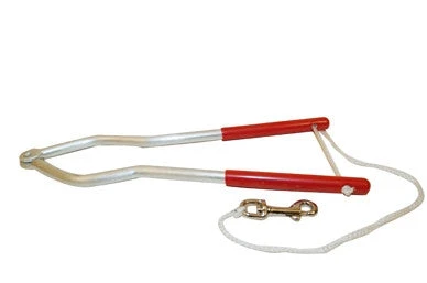 This humane twitch is used as a training device to help a horse relax under stressful situations. It is made out of aluminum and has a red hand gripper.