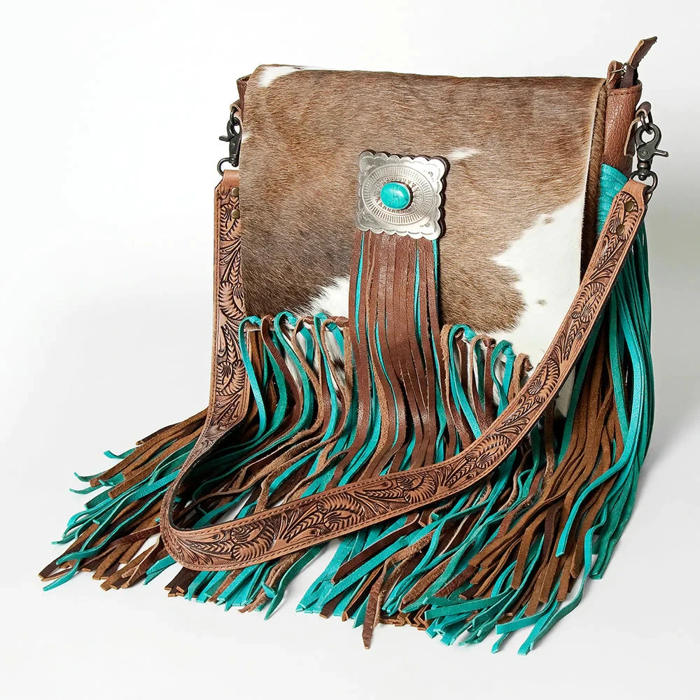 This purse has it all going on! We love the turquoise & brown fringe surrounding the purse!