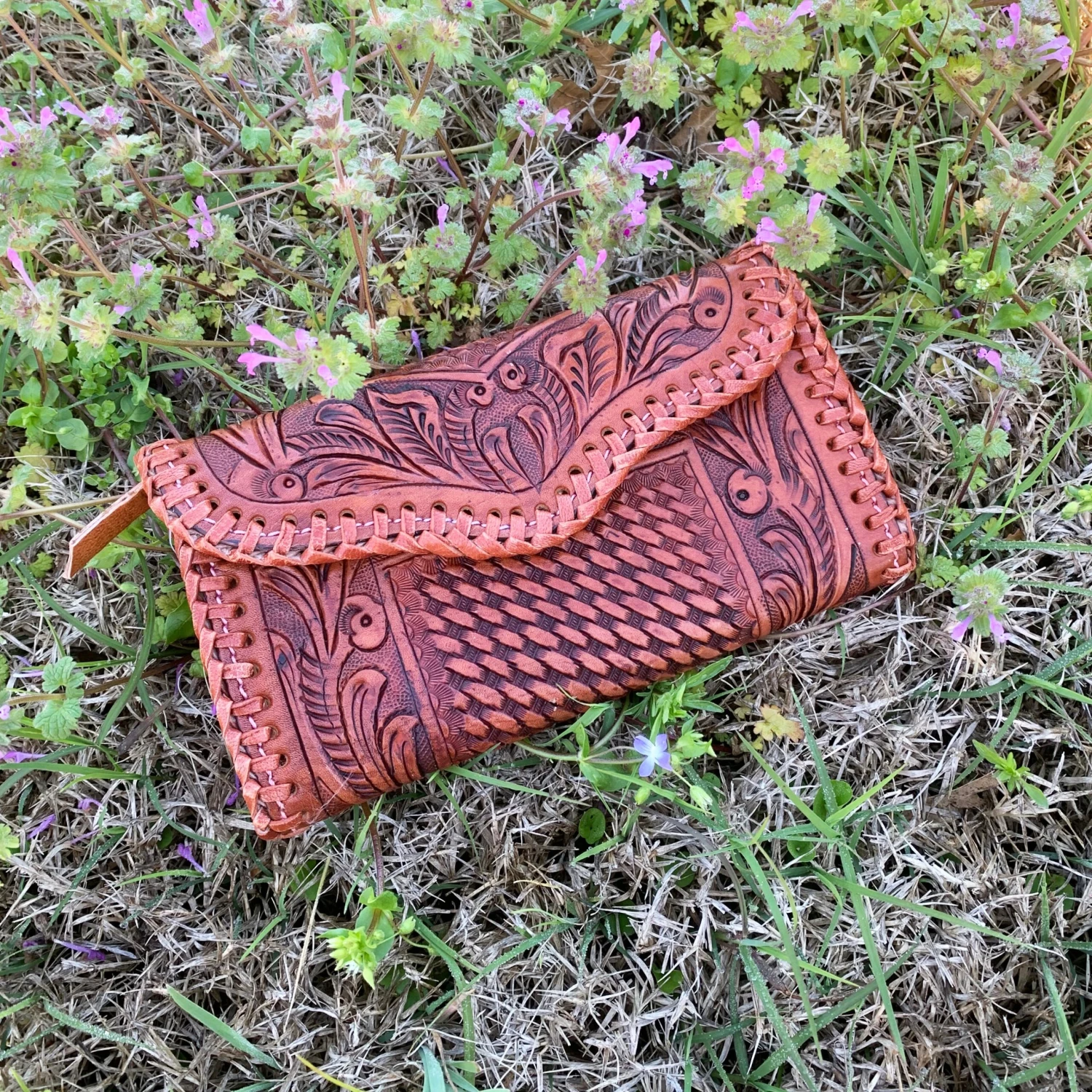 This elegant wallet will go with everything! The stain of the leather and the designs are perfect.