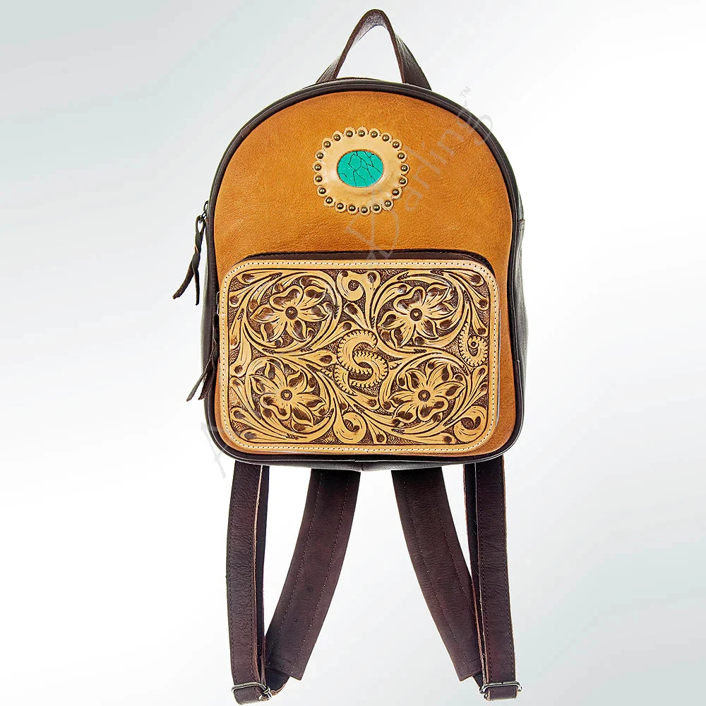 This is a beautiful backpack with all the tooled leather and how about that added touch with the turquoise stone!Â