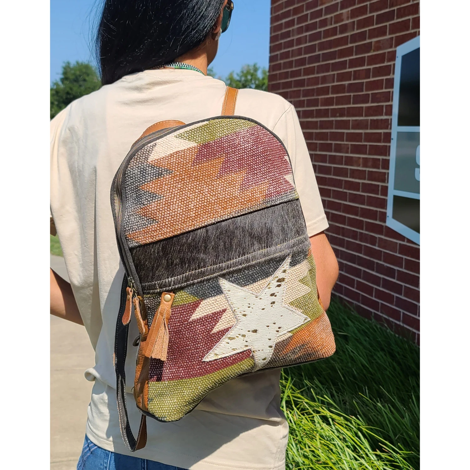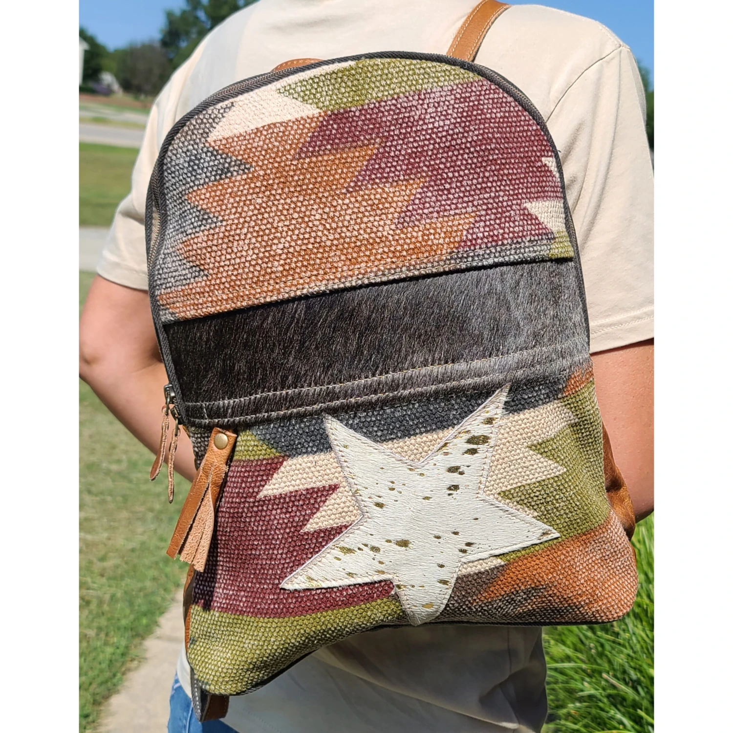 We just love the star on this fun Aztec Myra Backpack. A strip of cowhide leather that adds an extra touch is awesome. The extra pocket on the front makes this backpack very user friendly.Â