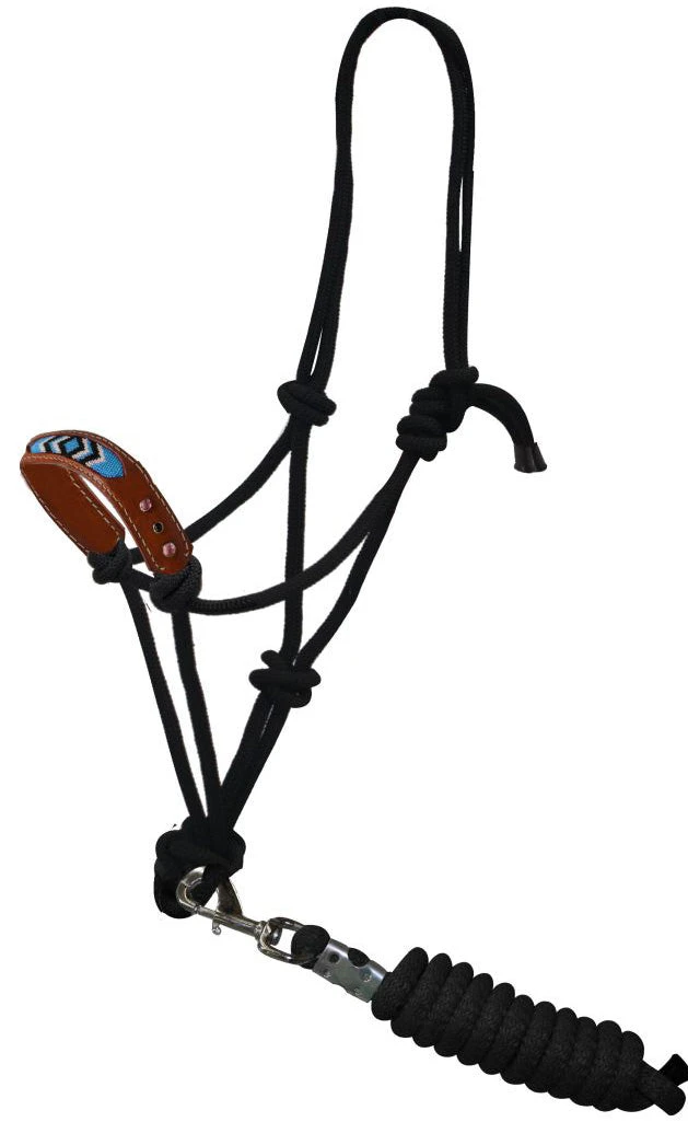 This halter features braided nylon with 1.25″ padded leather nose band. Nose band features beaded inlay and colored crystal rhinestone studs. Halter comes with removable lead rope with snap.Â