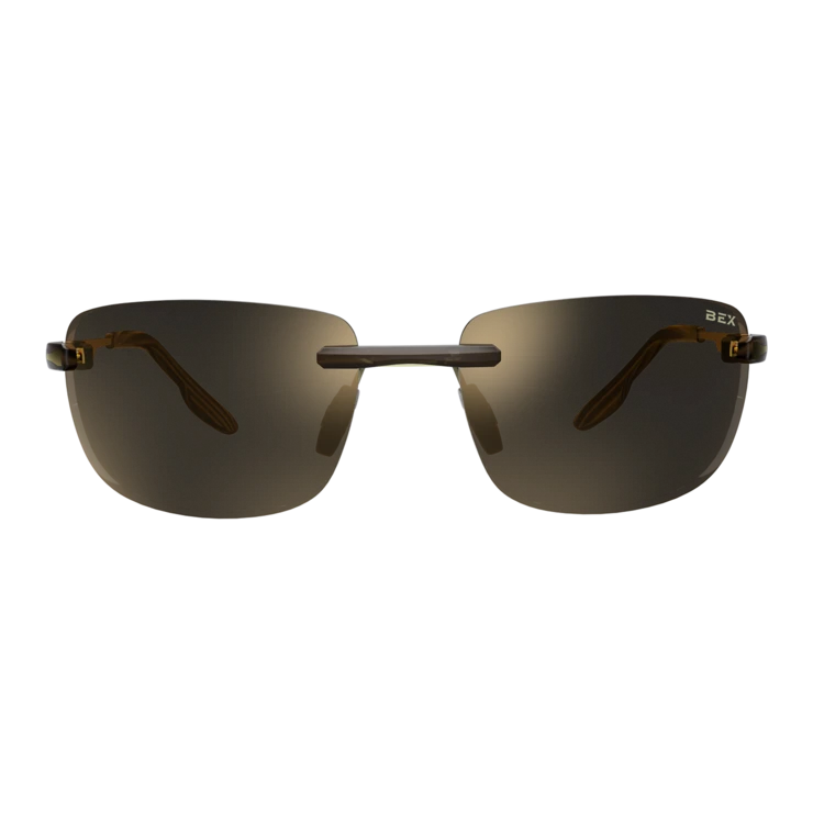 - Frame:Â A rimless hybrid design combining lightweight titanium and high-grade performance nylon. Available in a black-silver or brown-gold frame.
