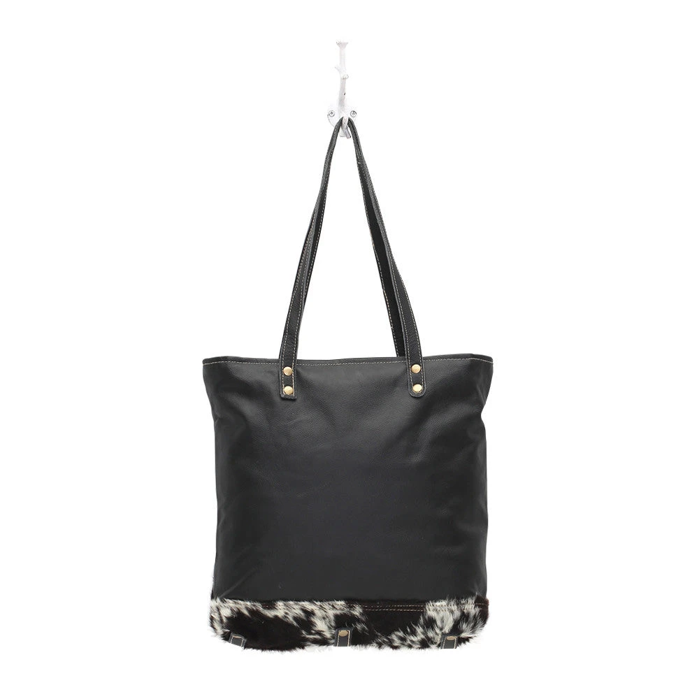 This women’s tote bag has authentic black and white hide with leather straps and a leather back! Big enough to tote around laptops, folder, books!Â