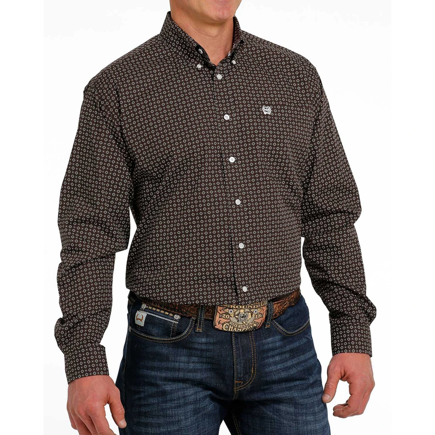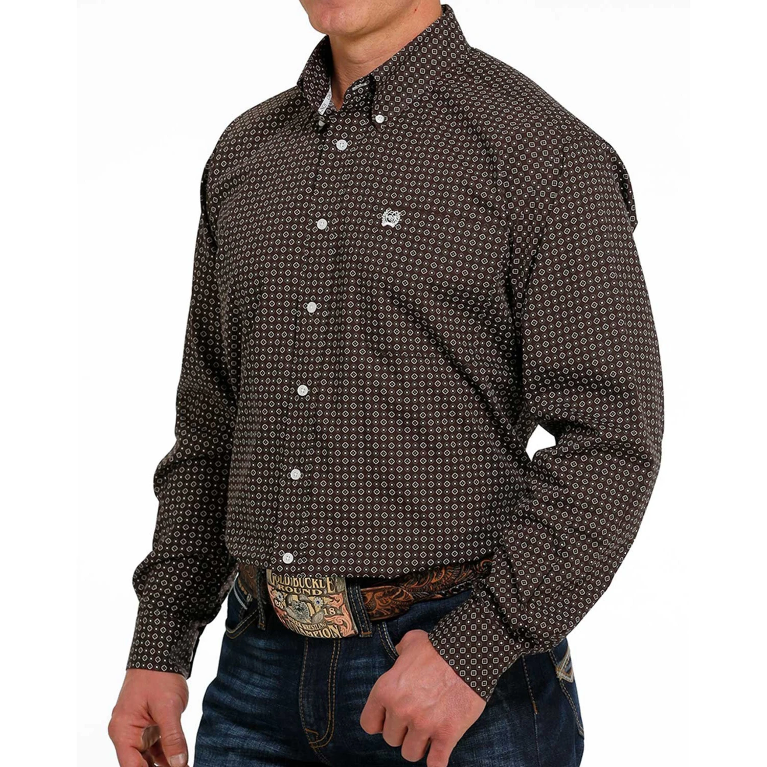 Looking for a shirt to go with jeans or khaki’s, this is it. This classic brown shirt features a geometric print, open left front pocket with embroidered logo and traditional white buttons.