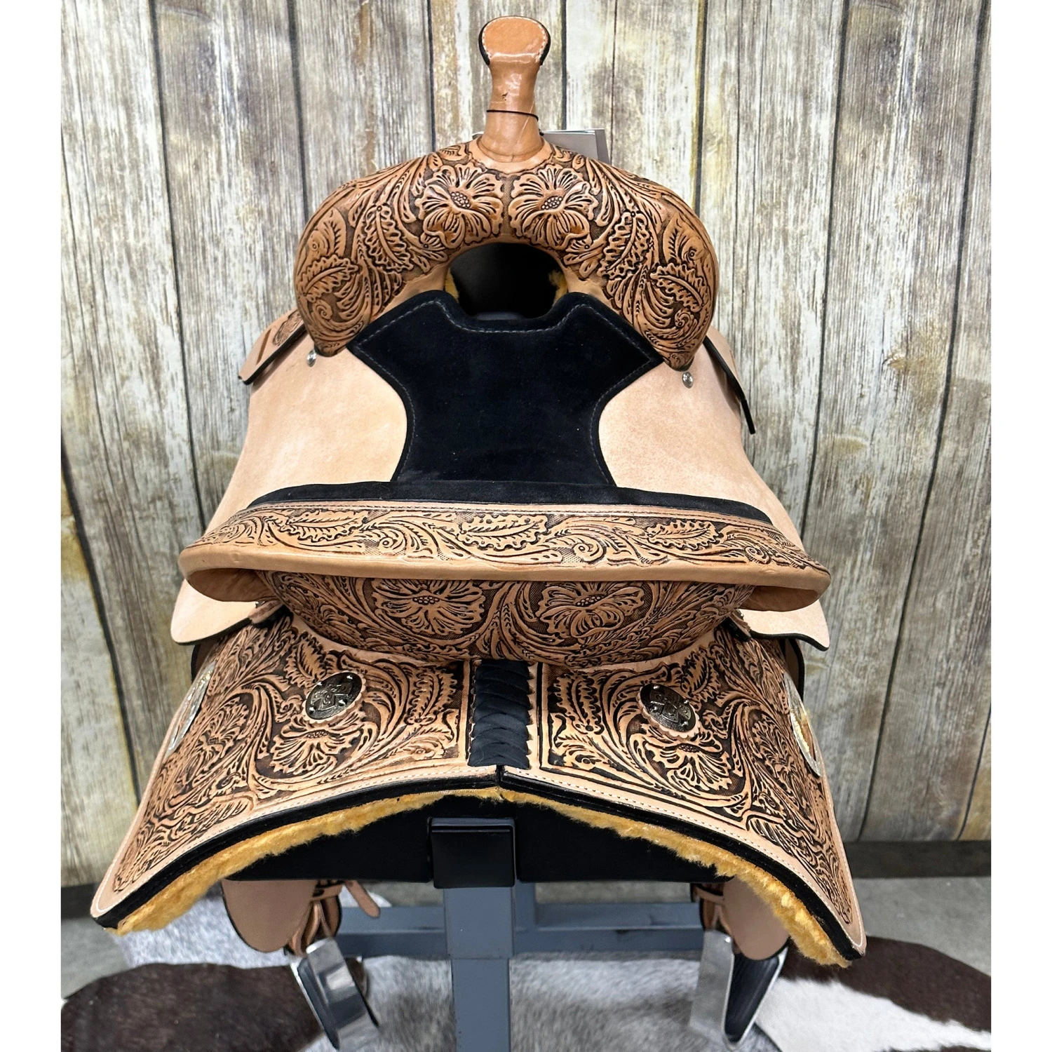 This Maltes Mansfield Barrel Saddle was designed to win. When looking at this saddle it has a 5″ inch cantle and hiphugger roll in the suede seat which helps secure the rider in position during the tight turns.Â