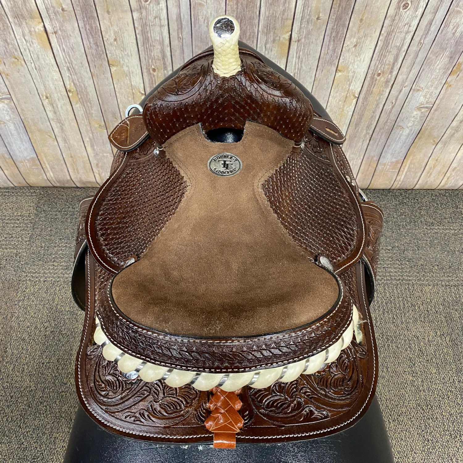 This youth saddle from Shiloh features a basket weave background with a brown felt seat. It makes for a great first saddle for any young cowpoke in your life. You can custom order the seat size!