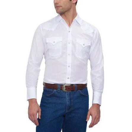 This basic solid white shirt for guys is the simplest you can get. It is a white dress shirt with a collar and snaps up the front.Â
