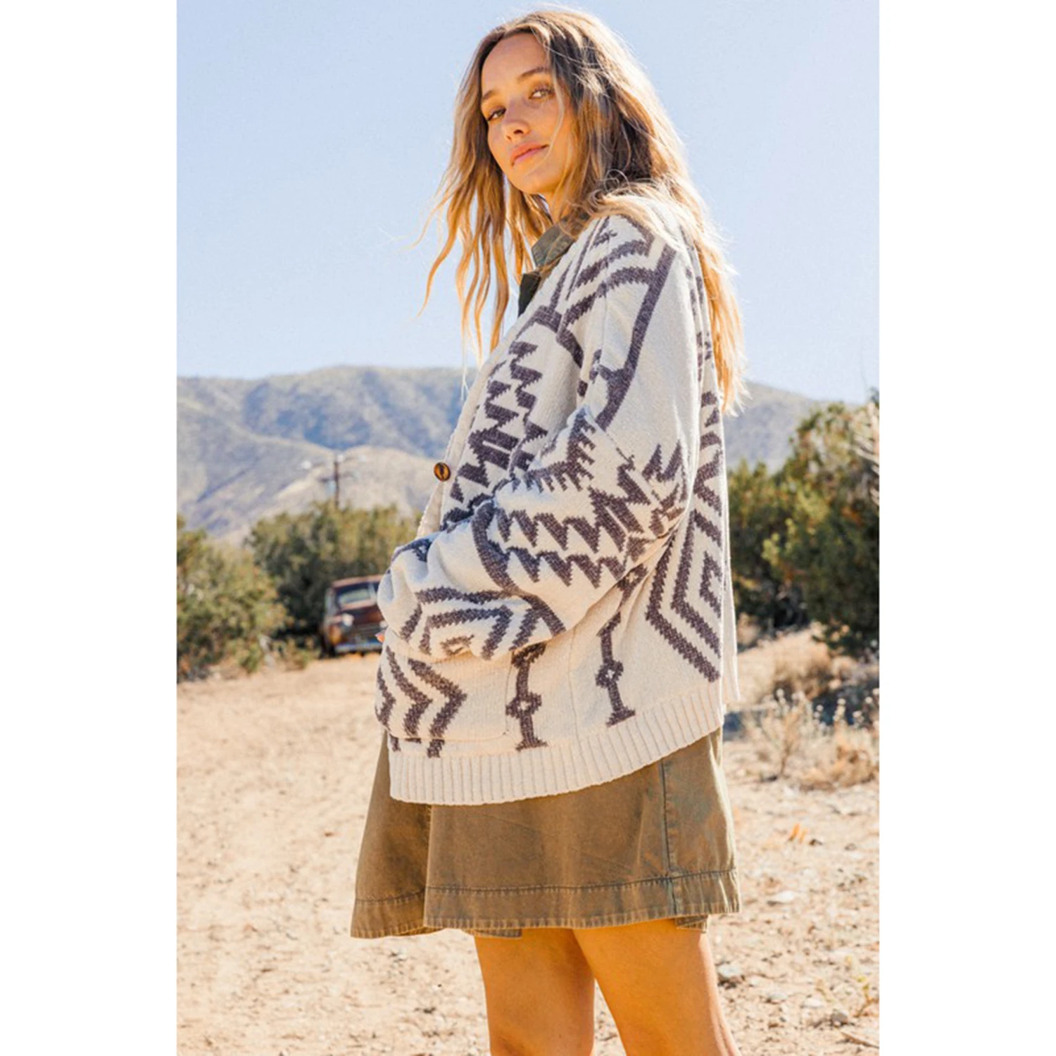 Hello fall!! We simply can’t get enough of this great geometric pattern Cardigan. The detailing is simply perfect.