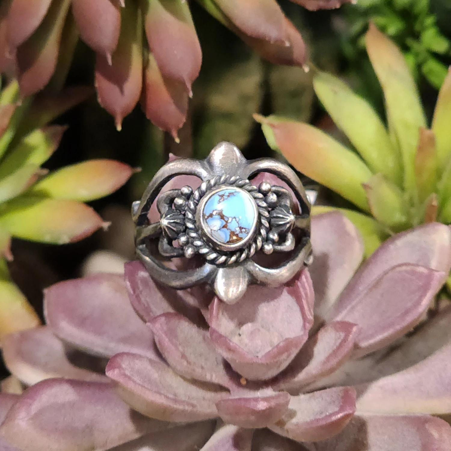 Just look at all the detail in this beautiful band and stone is that beautiful powder blue you expect from a golden hills piece.