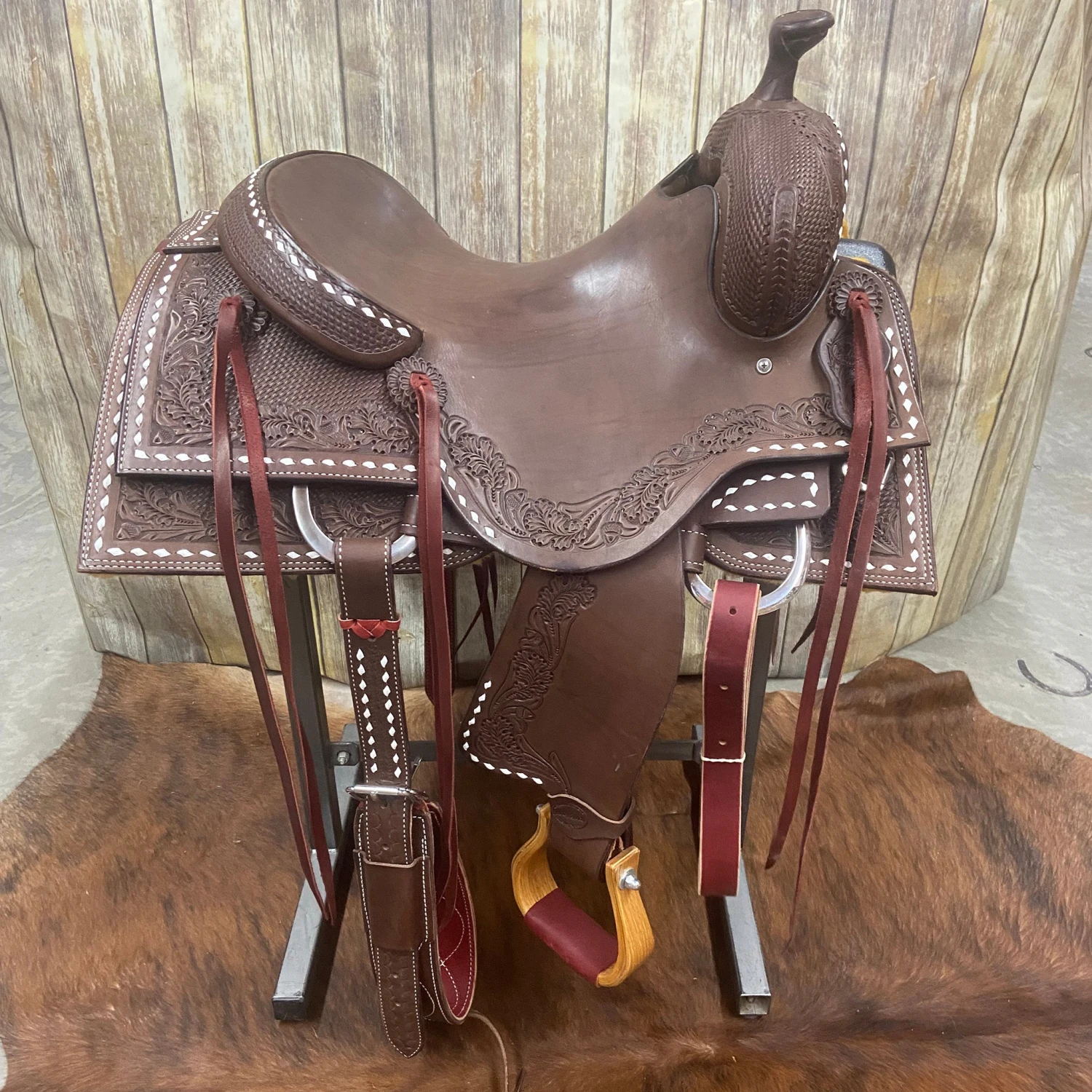 This beautiful chocolate HR Signature Cow Horse Saddle with white buck stich and floral tooling is one you will not want to miss out on. Whether you are going on all day trail rides or spending long hours in the arena, this saddle is one you can ride comfortably in. HR Saddlery does have a lifetime warranty on the tree of this saddle.