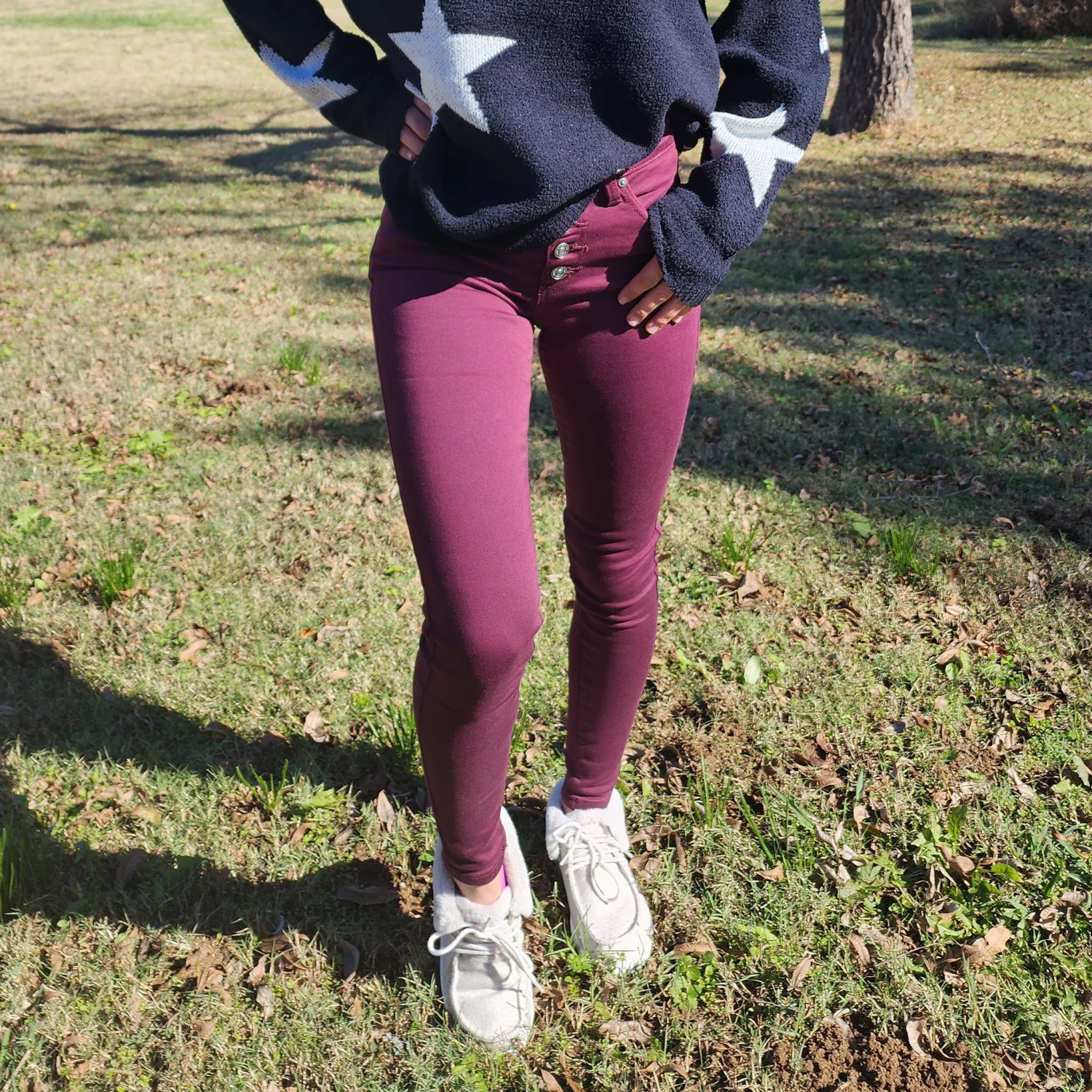 This burgundy skinny jean is fun and edgy. A high rise featuring a button fly and stretch denim, you’re going to be comfortable in style.