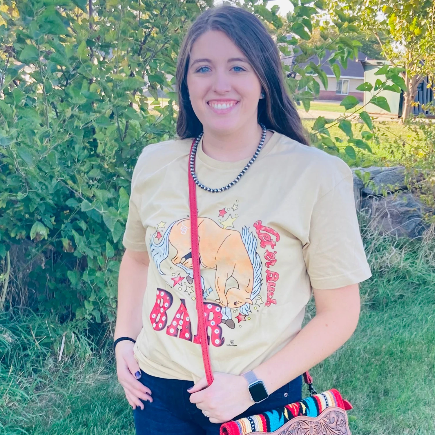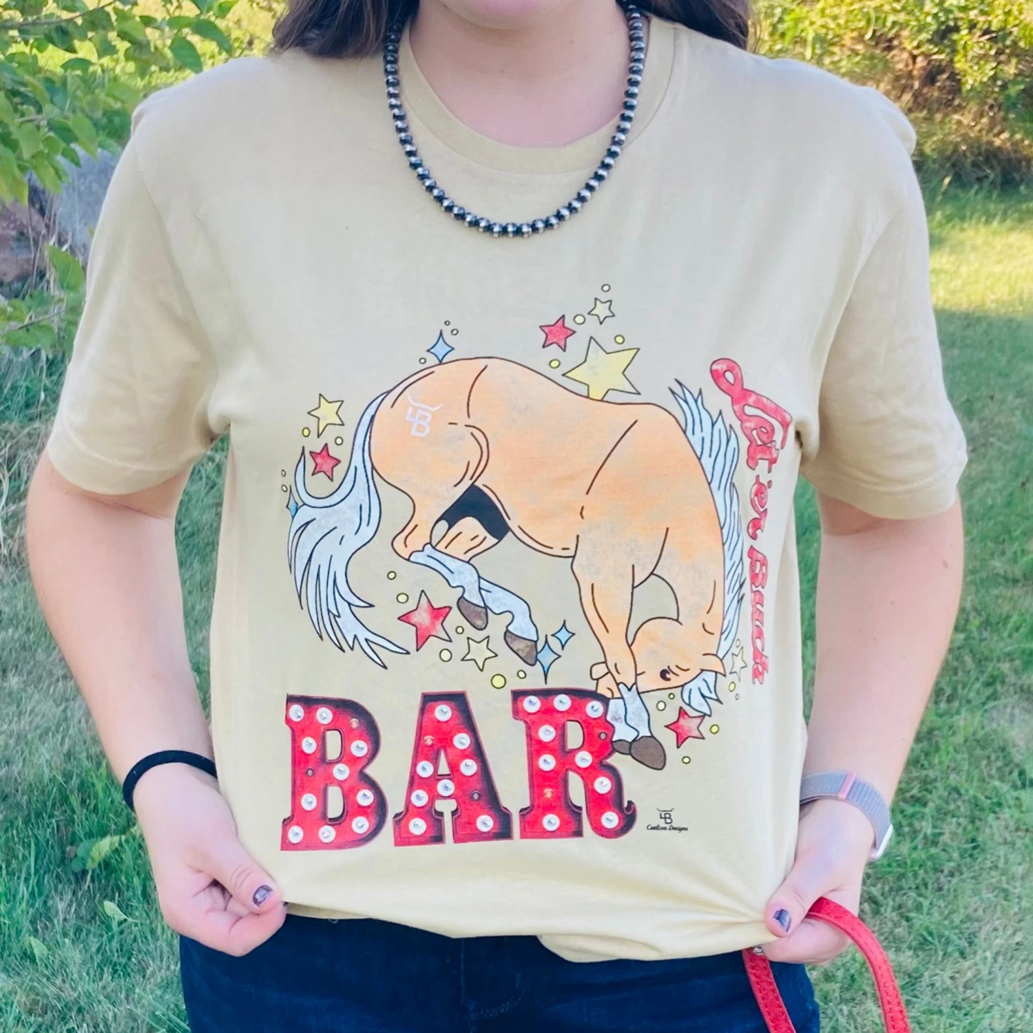 How fun is this “Let’er buck bar” tee with the fun bronc graphic on the front and unique font! Pair this tee with your favorite western jewelry and jean jacket!Â
