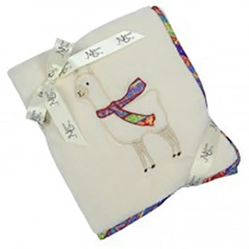 This super-soft plush blanket is trimmed with coordinating jersey cotton. Can easily be monogrammed! It measures 29″ x 40″ and features Llucky the Llama beautifully appliqued on the corner.
