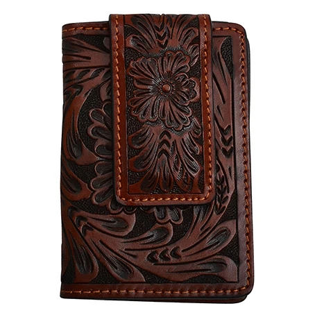 This brown floral embossed leather money clip is good for holding money and cards. It includes a money and magnetic clip.Â