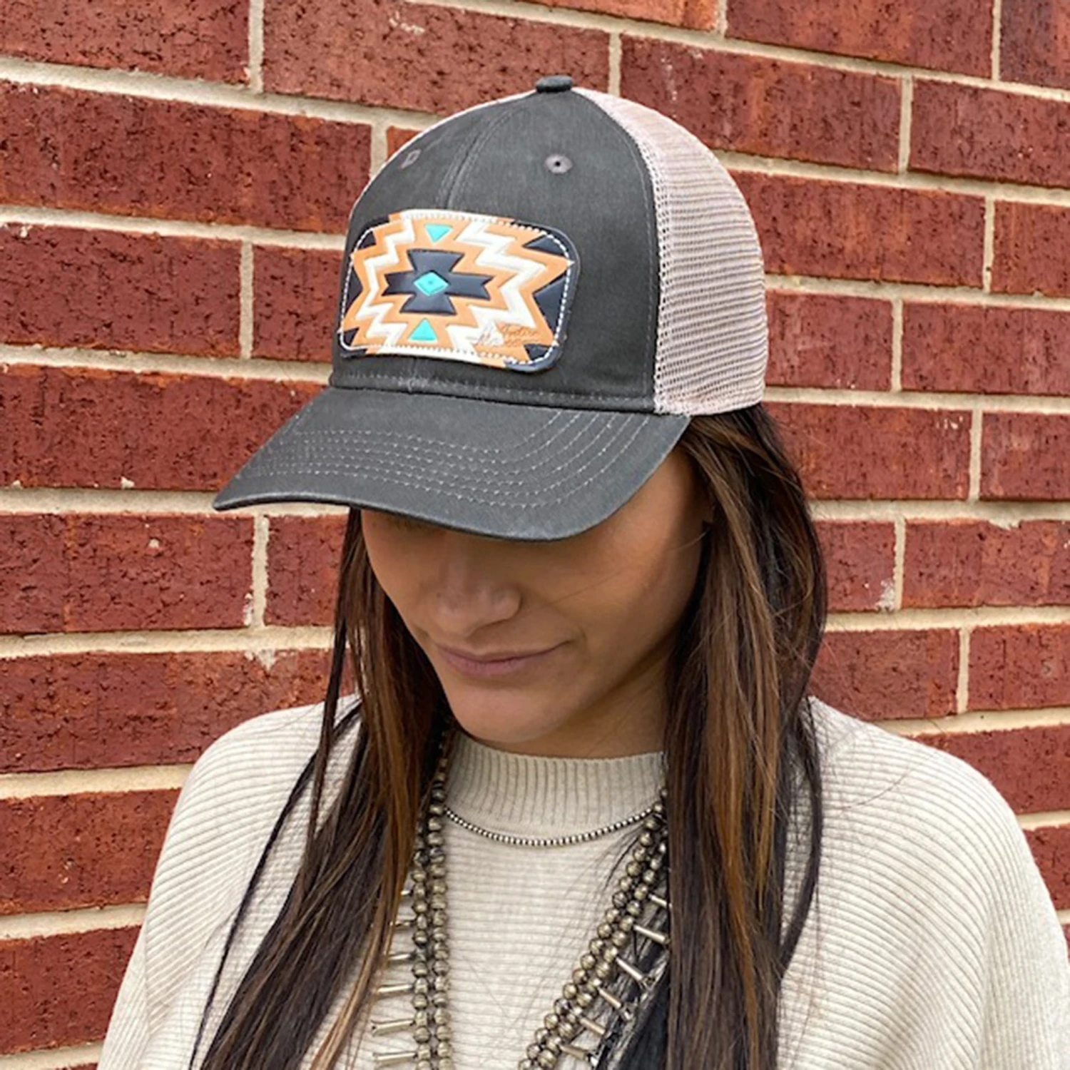 McIntire Saddlery Charcoal Cap with Black, White, Turquoise Aztec Leather Patch.Â