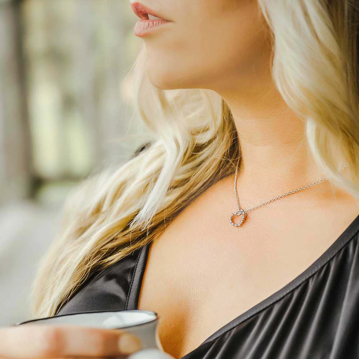 This heart shaped Montana Silversmiths necklace is perfect for that special someone in your life. The silver-toned heart hangs diagonally and is framed with studded crystals. The heart hangs from a 16″ chain.Â