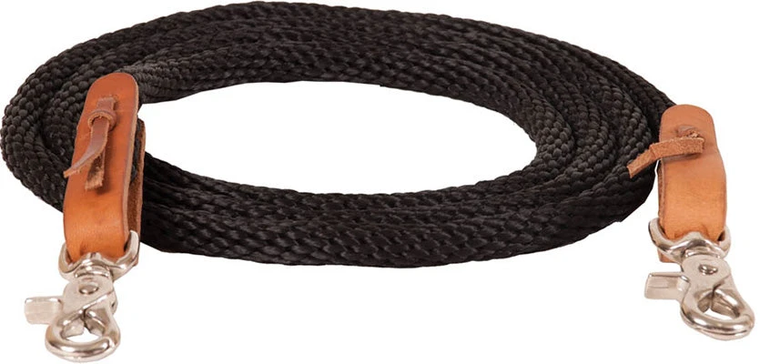Round braided poly reins with leather waterloop connectors and nickel plated trigger snaps.
