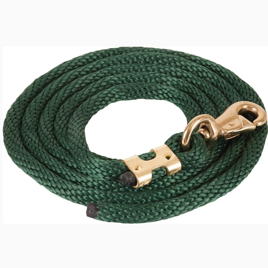 This hunter green poly lead rope from Mustang is a must have! It is 9′ long by 5/8″ wide. Its also has a 1″ brass plated bull snap!