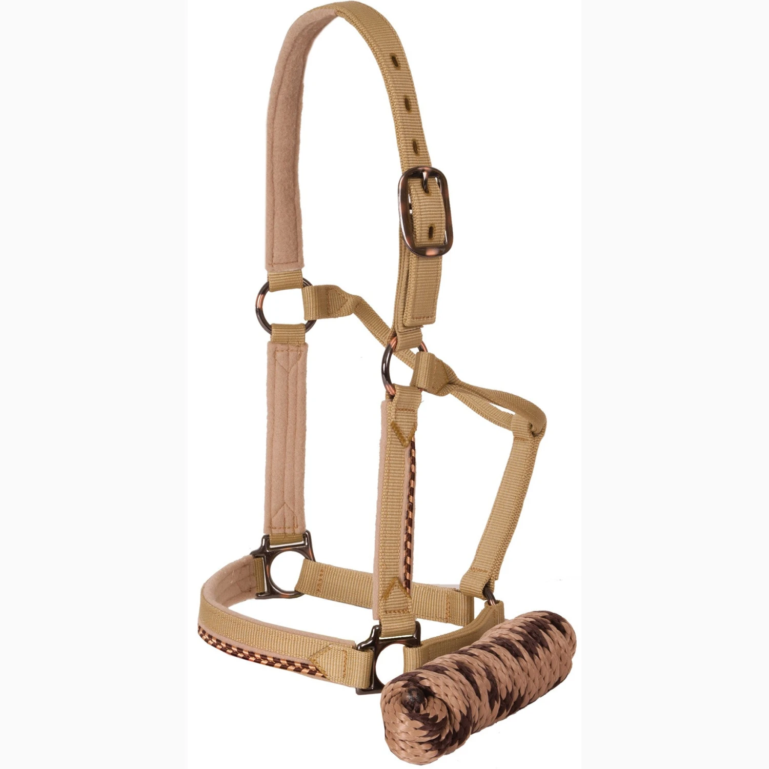 This standard buckle halter from Mustang is made from double ply poly! It has a felt lined crown and noseband, comfort rolled throat, and a matching two toned 8′ lead rope!