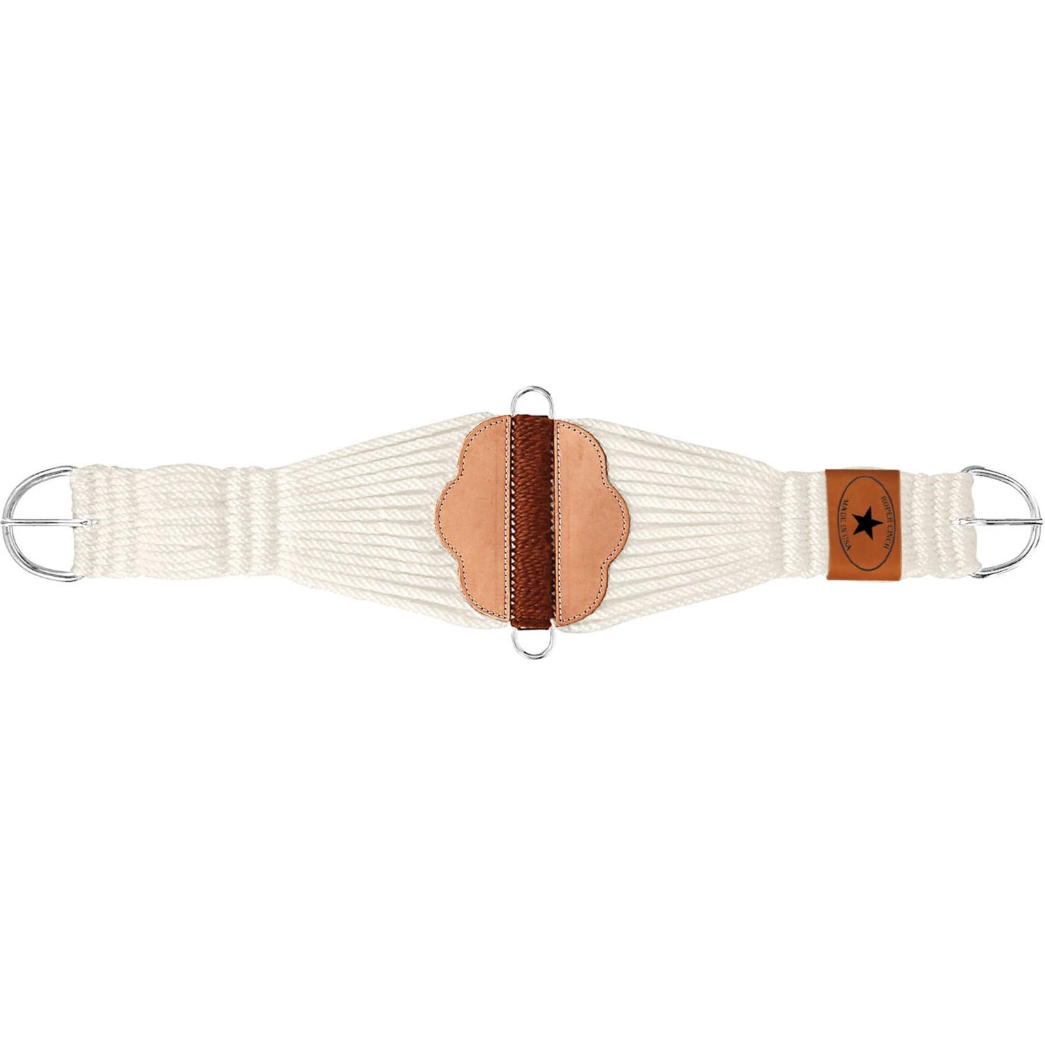 27 strand double woven white rayon cinch with nylon wrapped center and scalloped leather reinforced bars. Cinch features 3” nickel plated straight pull buckles and 1” dees.