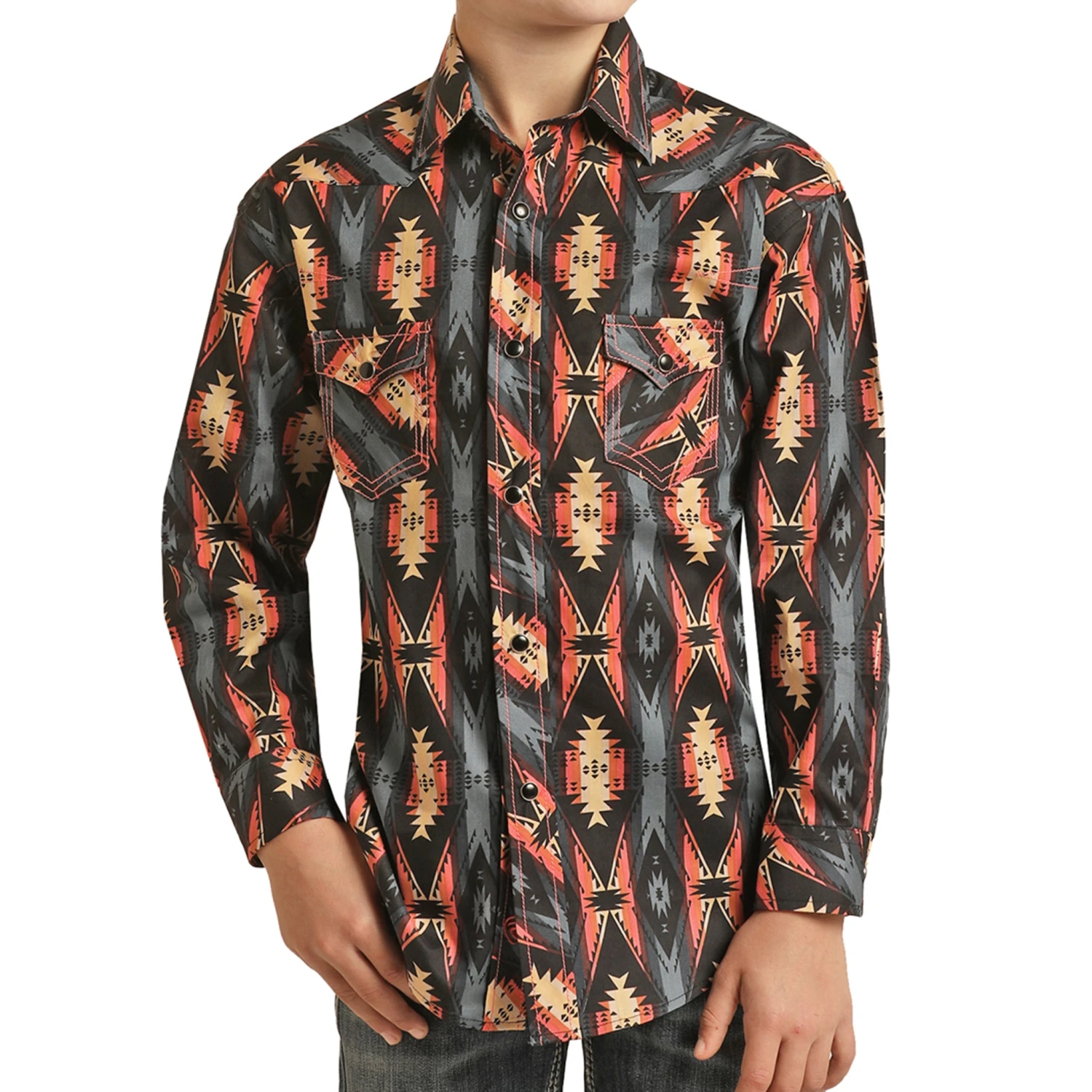 Panhandle Slim brings you this boys southwest style snap long sleeve shirt. This Aztec design includes many peach, yellow, gray and black colors.