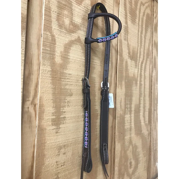 This dark oiled basket weave slip ear features aztec beading with colors of purple and black with hints of turquoise around the ear and on the cheeks.