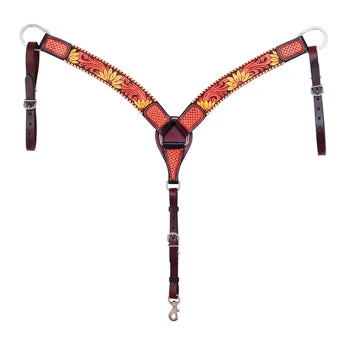 Colorful hand-painted sunflowers adorn this two-toned tooled breast collar by Rafter T Ranch Company. Bordered with metallic whip stitch and additional basket weaving on corners adds even more detail.