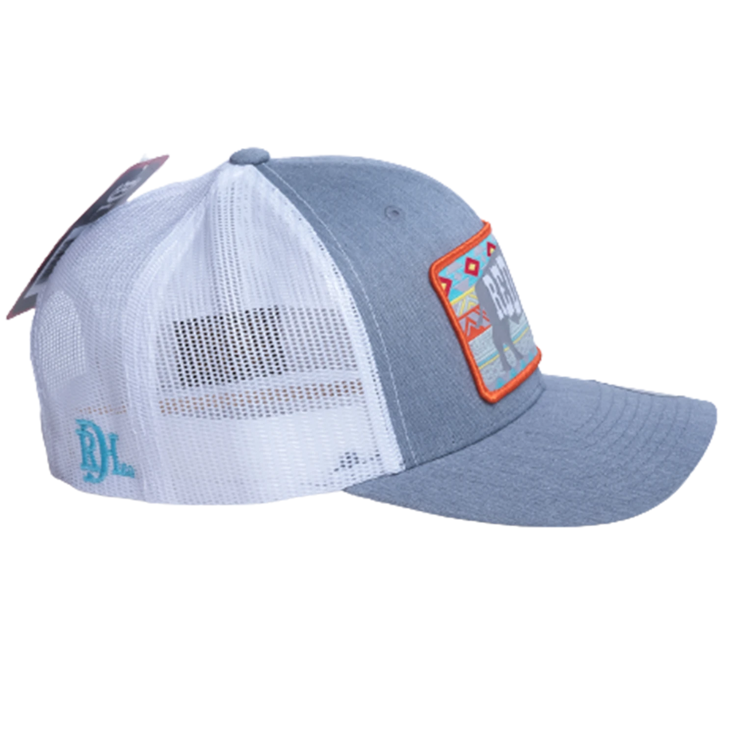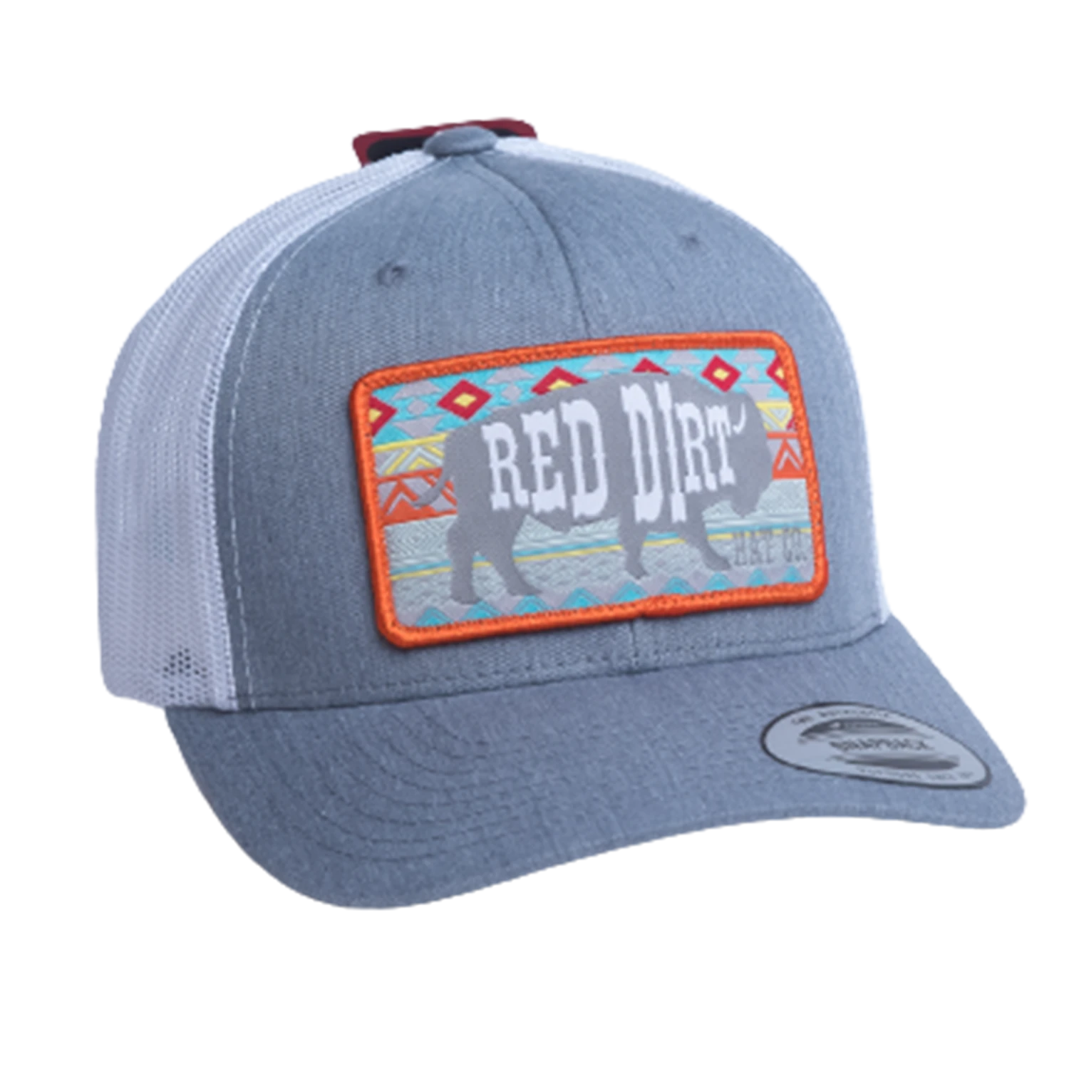 This Red Dirt Cap is heather grey and white has the 6 panel style, snapback, & features the “Aztec” patch.