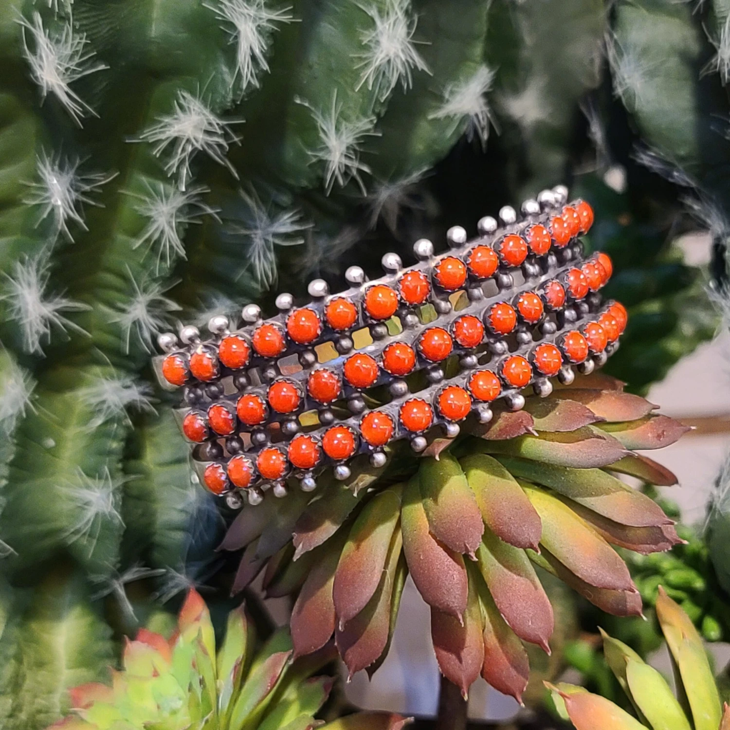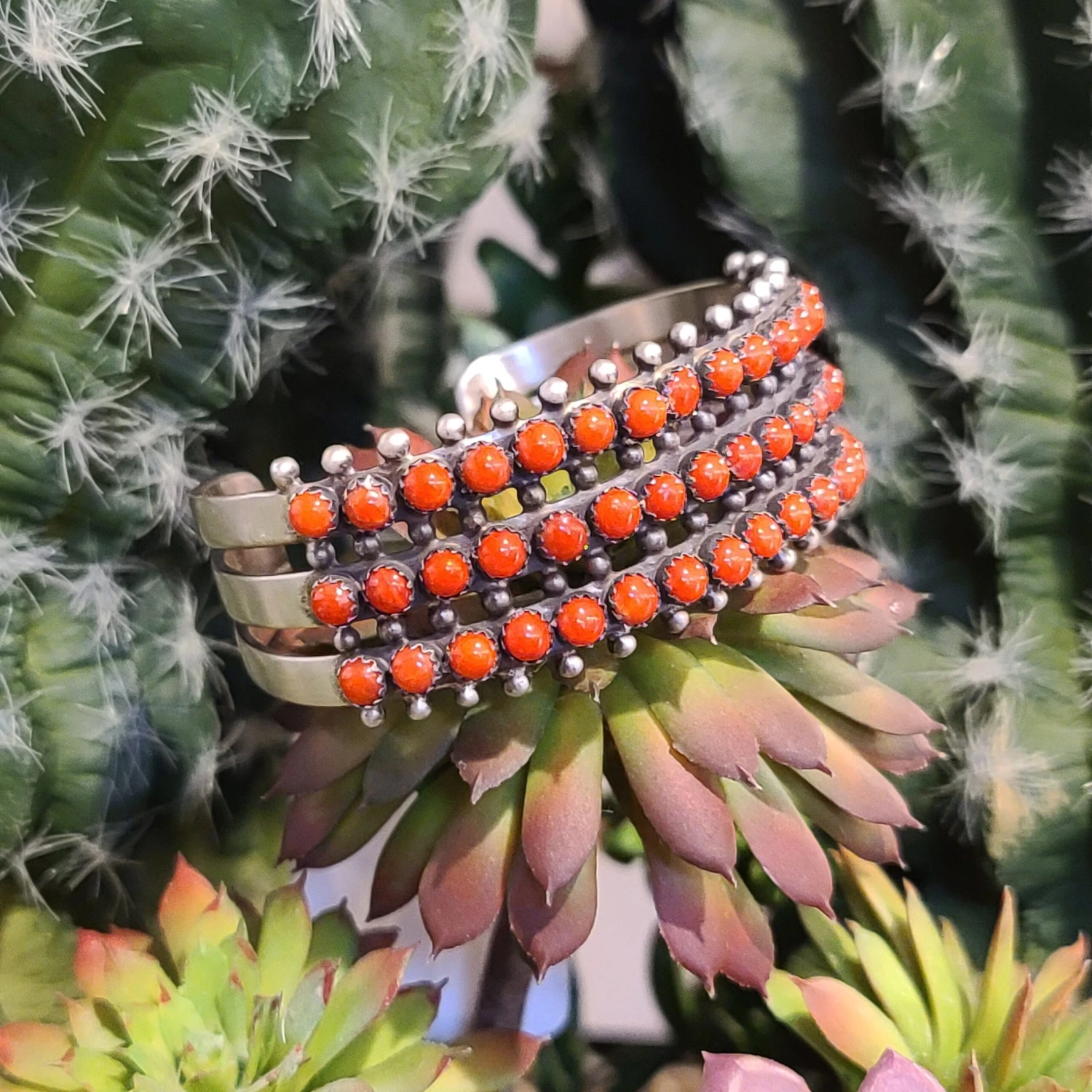 This snake eye coral cuff is a beautiful piece. 3 full rows of stunning coral with beautiful red color. Paul Livingston has truly out done himself with this piece.Â