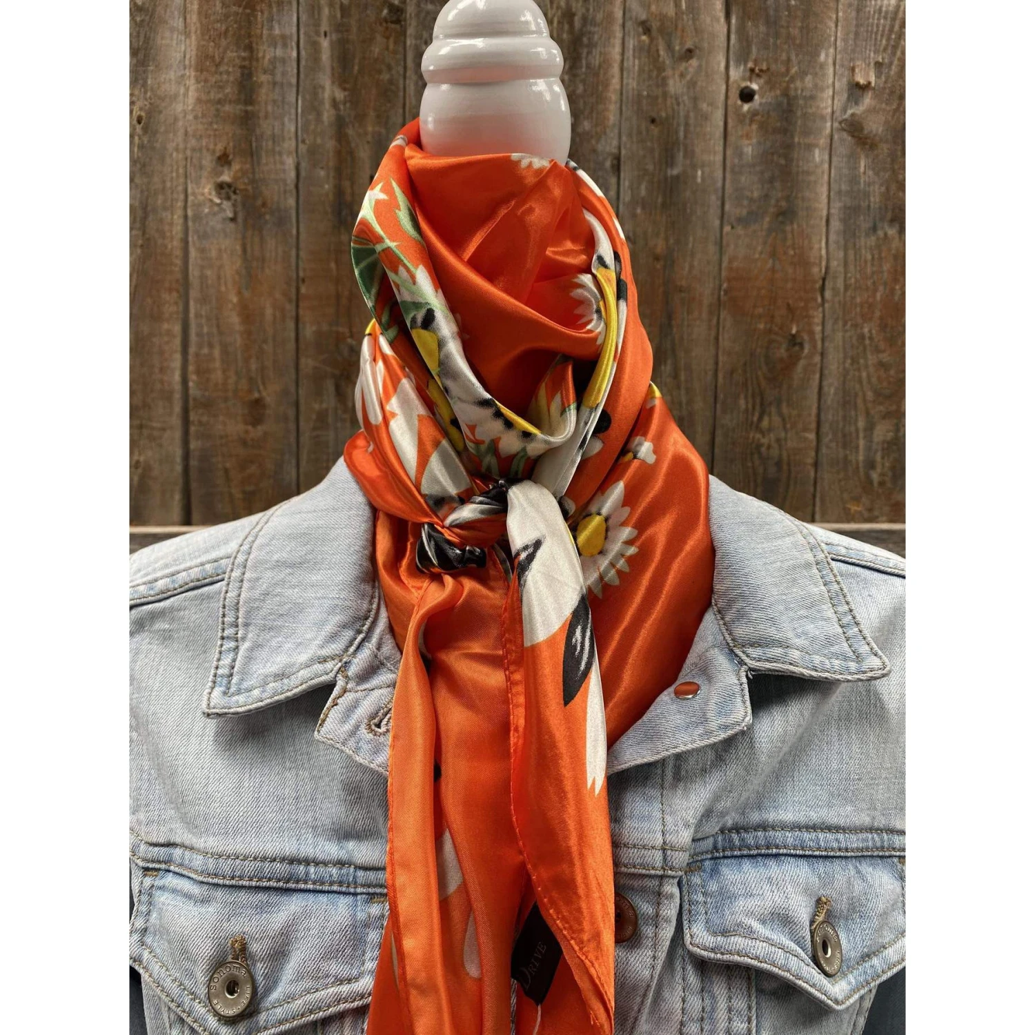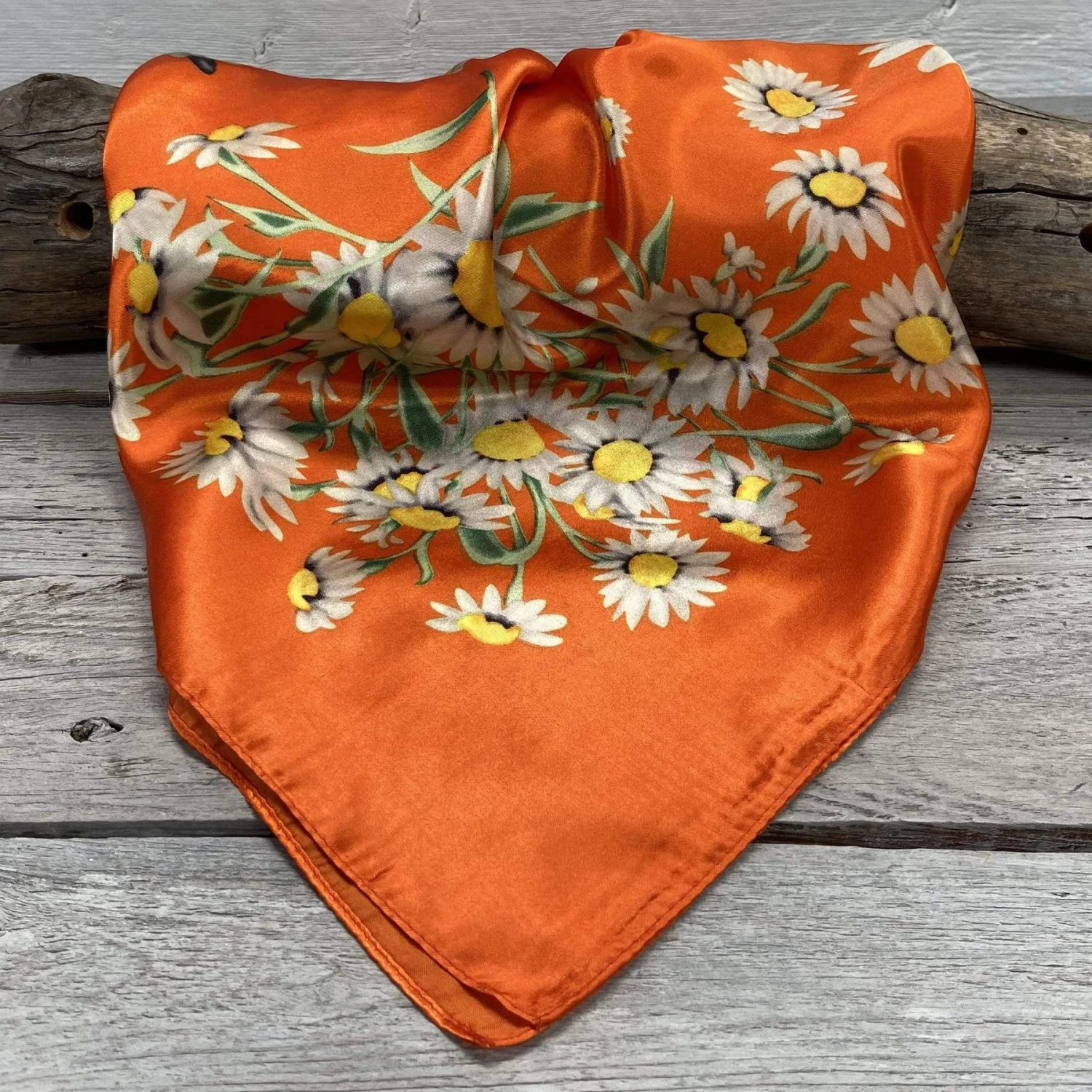 This orange daisy wild rag is perfect for a rodeo or for a nigh out on the town. Not only is this wild rag cute it is also super soft and silky.