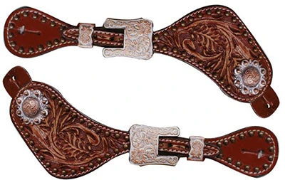 Floral tooled spur straps accented with an engraved copper buckles and conchos accented with an antique white finish. Adjust 9.5″ -10.5″Â