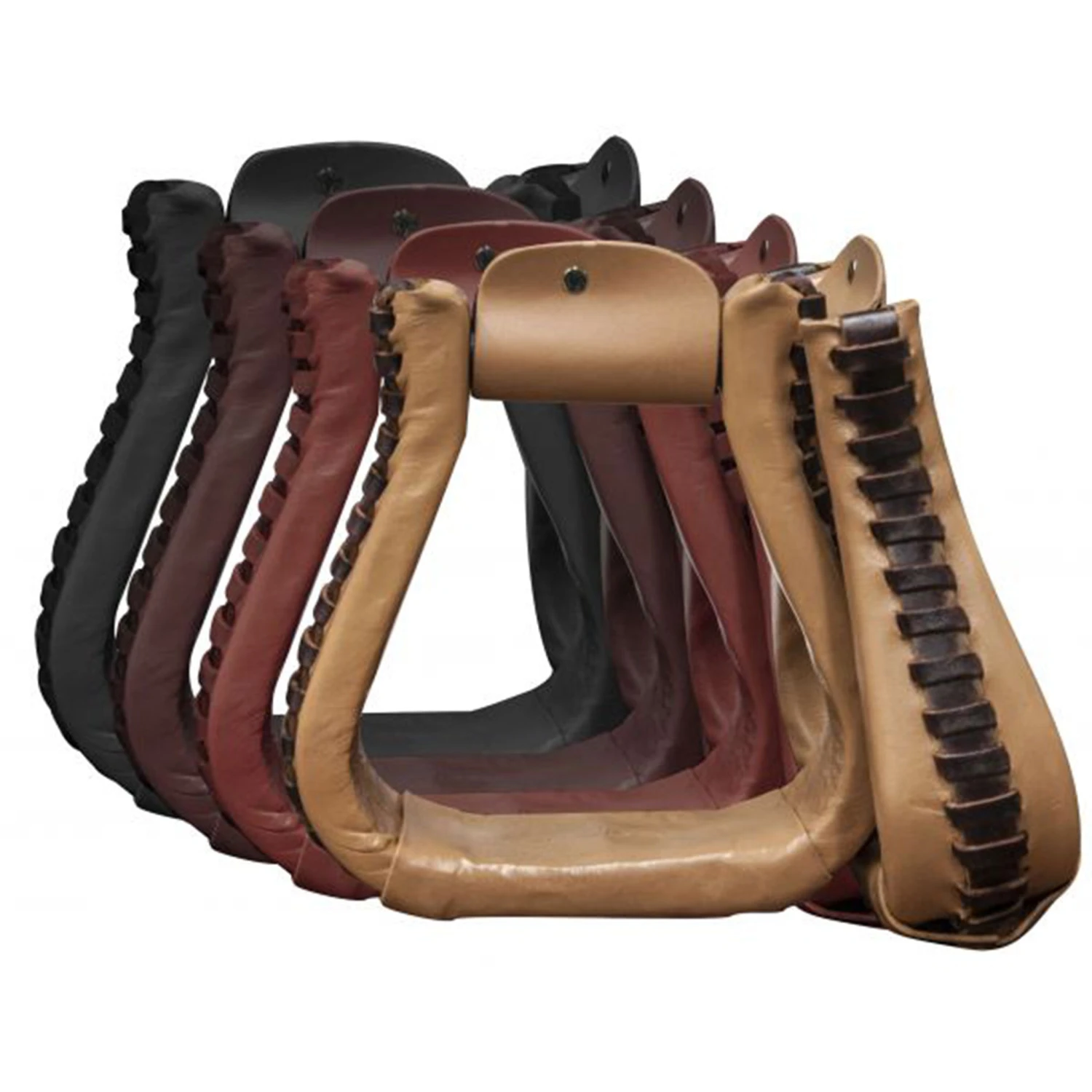 These western stirrups are covered in leather and have leather lacing down the sides. They feature a 3″ neck, 2 1/2″ tread and they are 5 1/2″ wide. Â