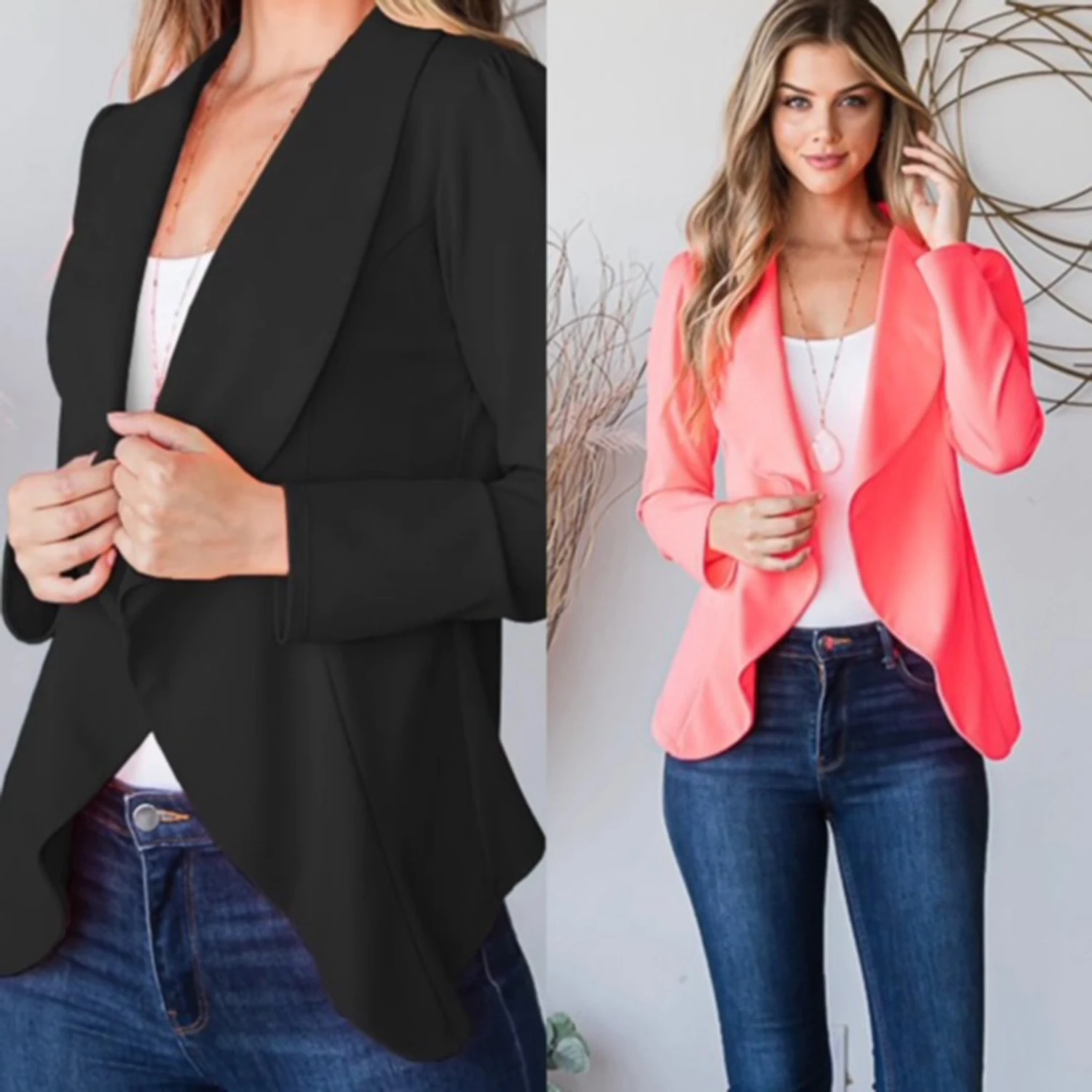 Dress up any outfit with this classic open front blazer. The front has a waterfall look, while the back has a tailored fit. Choose from black or hot pink, or get them both.