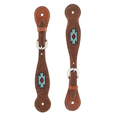 These Spur Straps from Weaver Leather are medium oiled! They offer a turquoise and red beaded design to them.