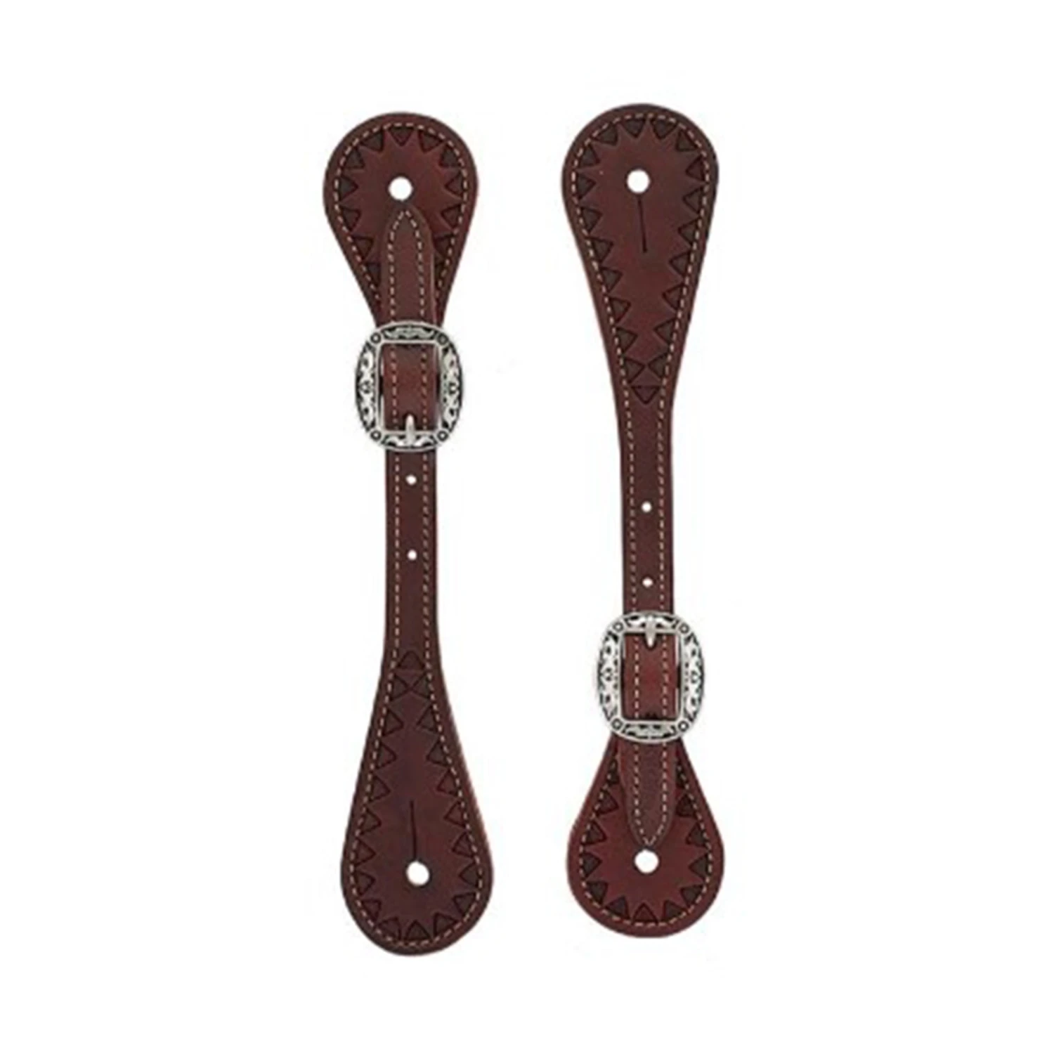 These youth spur straps from Weaver take special details to a new level in spur straps. The straps are handcrafted from chestnut skirting leather featuring a triangle hand tooled border and floral engraved buckles with black accents.