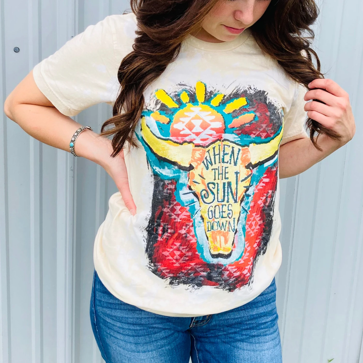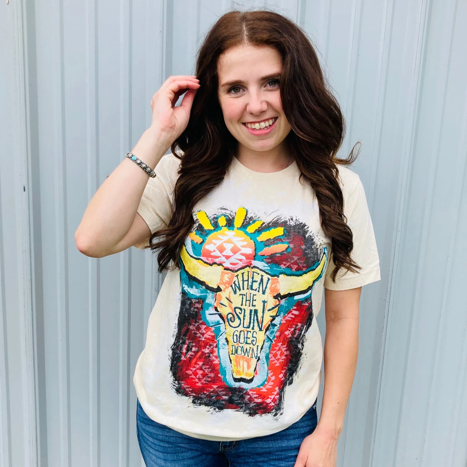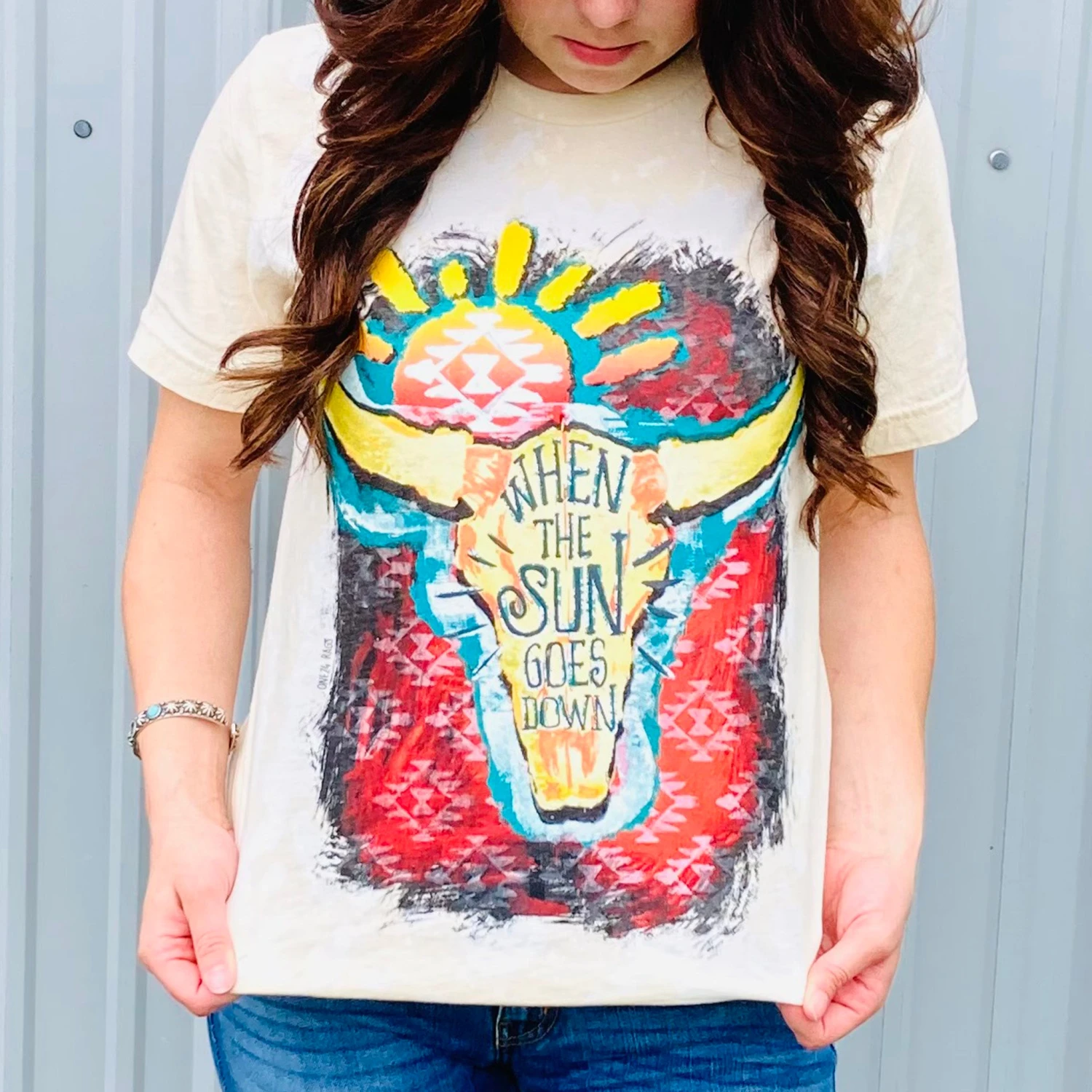 This “When the sun goes down” tee is so colorful with the steer head graphic on the front with a bright sun graphic popping out behind it.Â